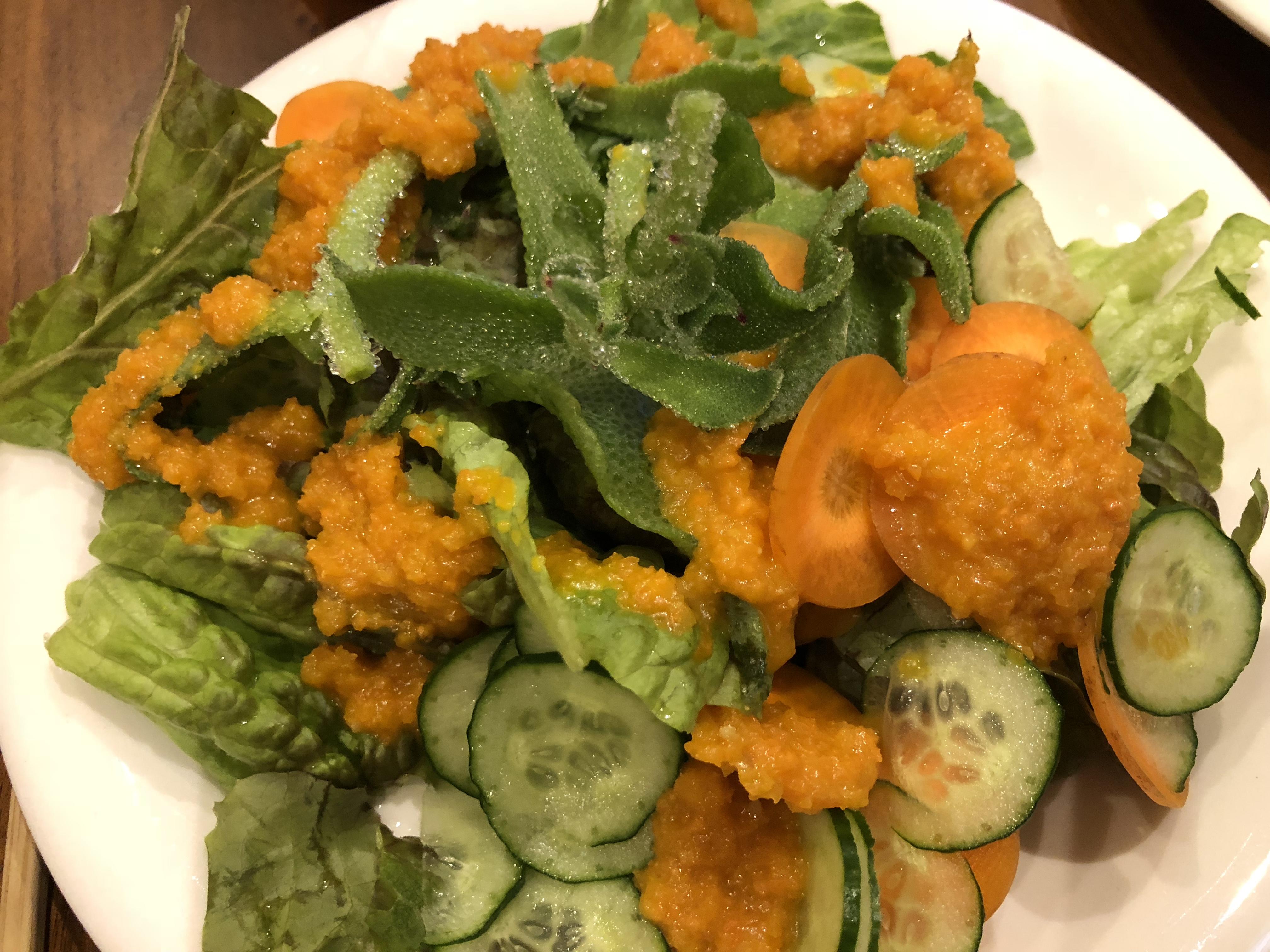 大きすぎるレタス、サニーレタス、人参、アイスプラント。人参と新玉ねぎでドレッシングも作りました。